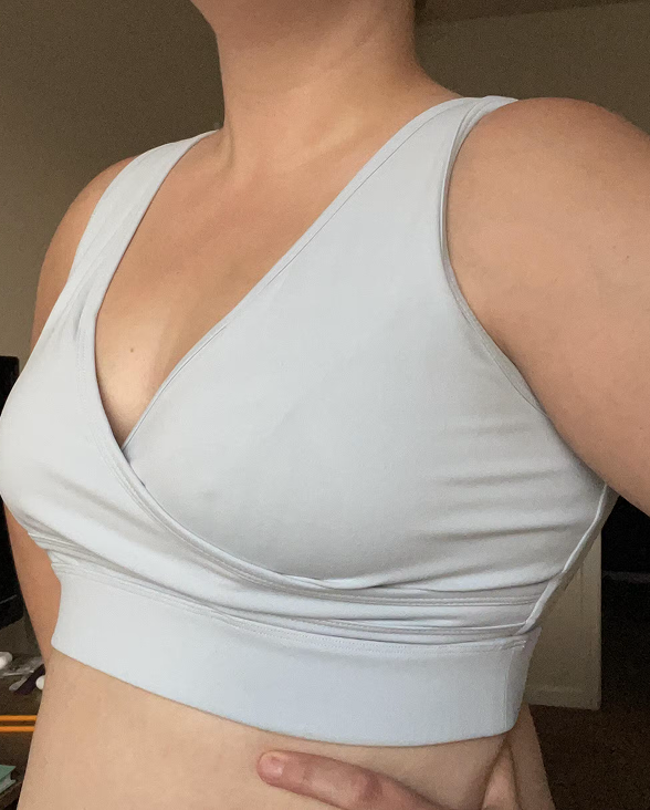 I LOVE this bra! First, the material is so buttery soft. This is the only bra I wear for night time pumps. I don’t dread putting it on. Second, the blue color is soo pretty! And third, I LOVE that I can nurse and pump in it! It fits the flanges so nicely and actually holds them in place.